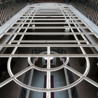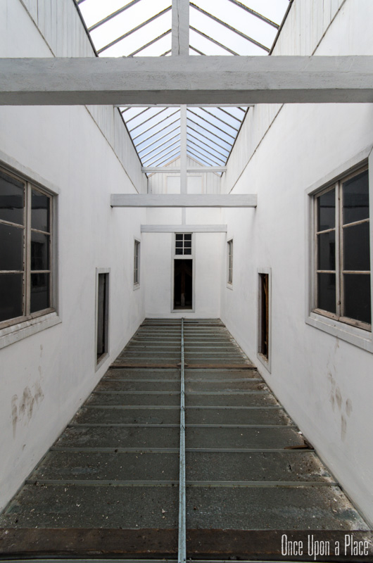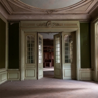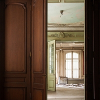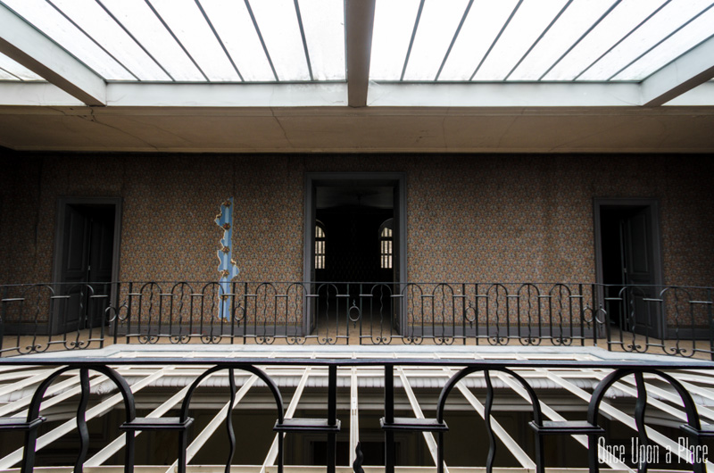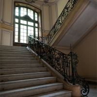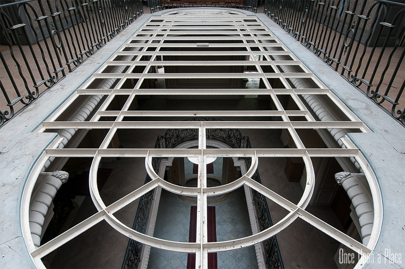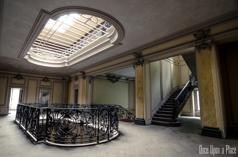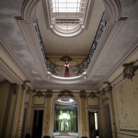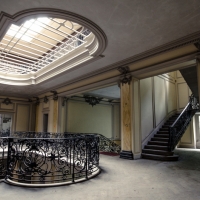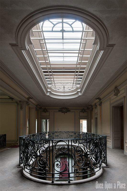 S'élevant sur 4 étages, le tout surmonté d'une verrière en parfait état, chaque niveau laisse en son centre ce puits de lumière propager un éclairage doux et homogène. De nombreux volets sont fermés, mais la lumière naturelle suffira à explorer et photographier les pièces.