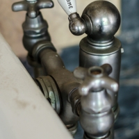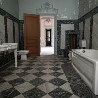 Nous entamons la visite par le rez-de-chaussée. Un immense tapis rouge traverse tout le hall, de la porte principale jusqu'à l'immense miroir à l'opposé. Les boiseries, les colonnes de marbre, les vitraux, voilà encore quelques témoins de ce qu'était une habitation luxueuse à cette époque. Même les nombreuses salles de bain font preuve de raffinement.