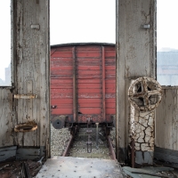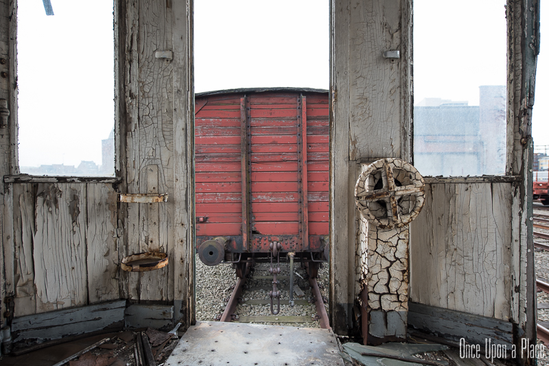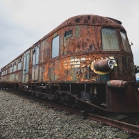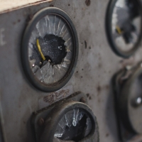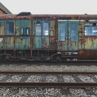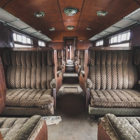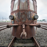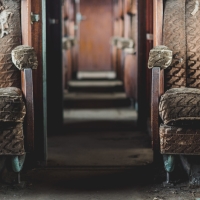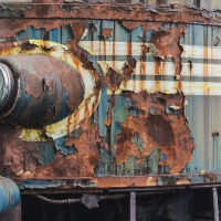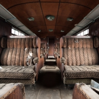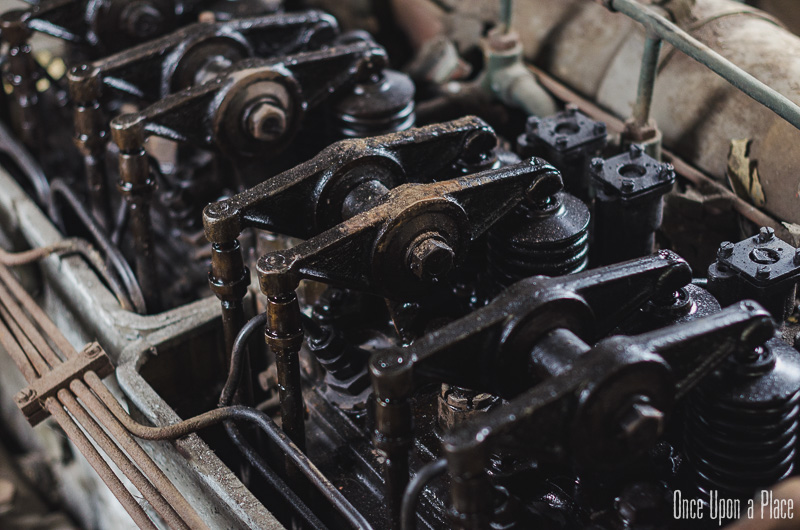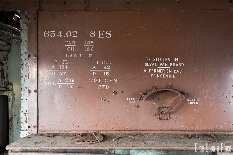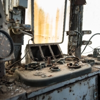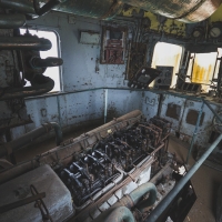 Nous remontons le wagon jusqu'à la tête, où se trouve encore la machinerie et tout le tableau de commandes, qui fourmille de détails. Les vitres sont opacifiées de saleté accumulée au fil des années et d'un manque évident d'entretien, ce qui confère à l'espace une lumière tamisée, où chaque élément se dévoile à notre approche. Au centre, sont exposées à nu les "entrailles" de la machinerie, recouvertes d'une épaisse couche graisseuse, et dont s'échappe cette odeur âcre de métal huileux.