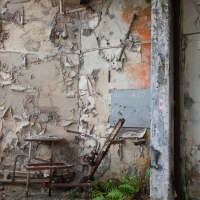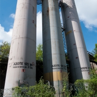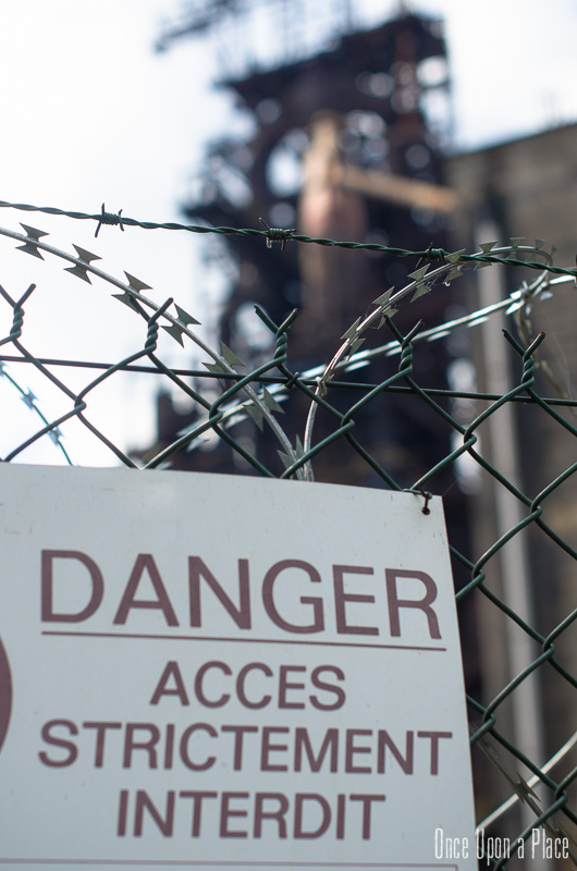 Retour à la clotûre qui ceint le terrain. Nous cherchons un moyen de pénétrer mais l'exercice s'avère peu avenant puisqu'il nous faut également franchir des barbelés rasoir. Finalement, avec un coup de chance et quelques coupures aux mains, nous y sommes. Nous débutons la visite par un premier bâtiment histoire de se mettre en jambes, avant de nous attaquer à ce géant de métal de 80 mètres de hauteur.
