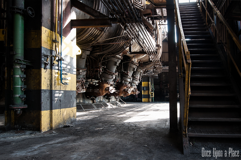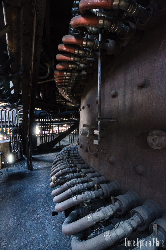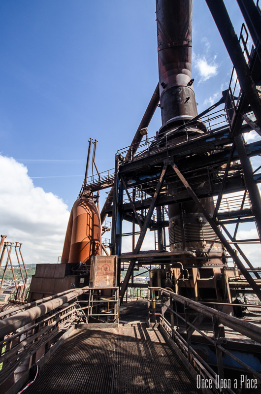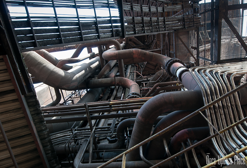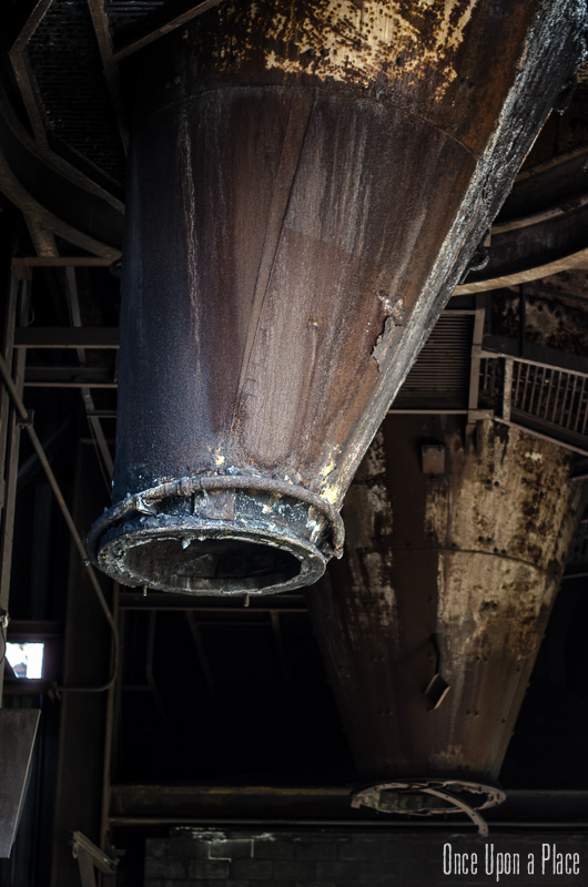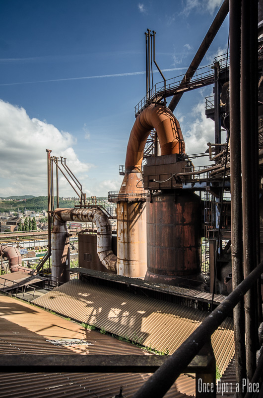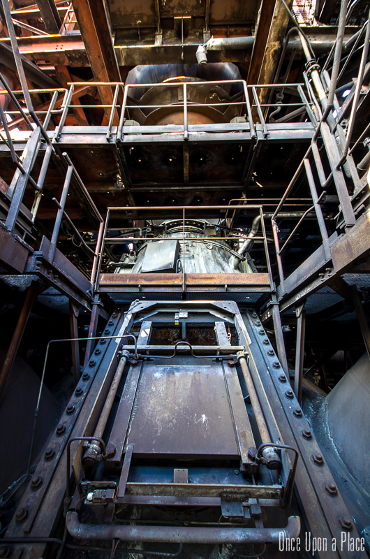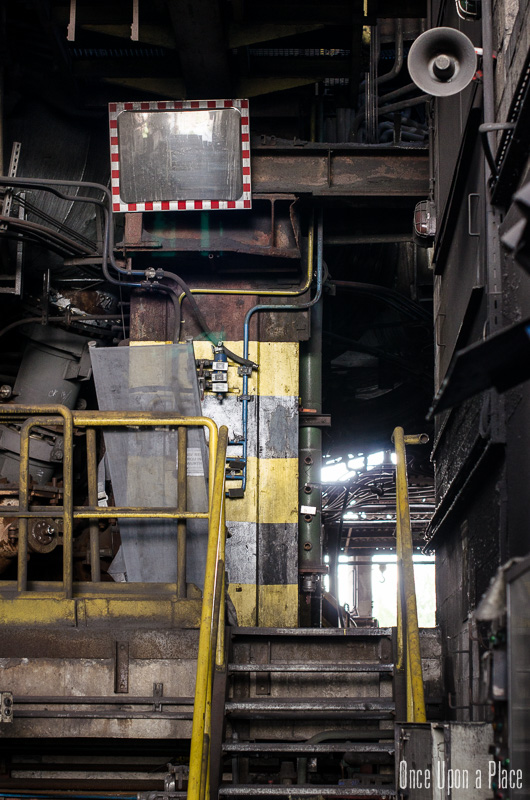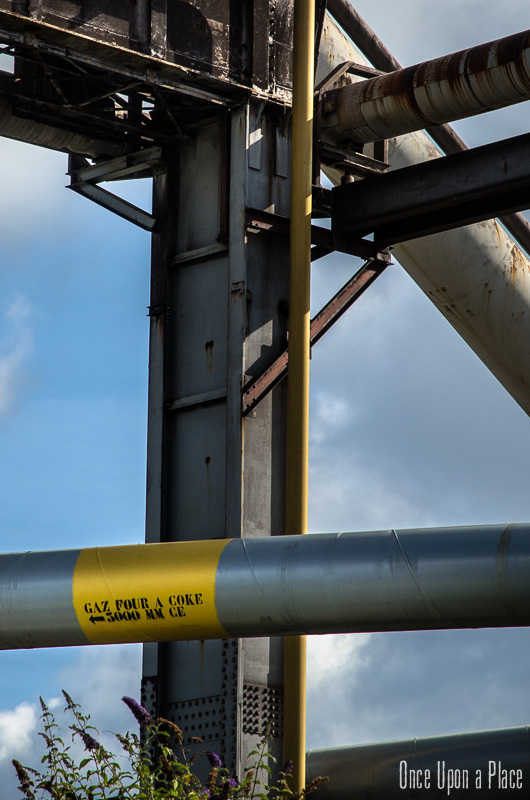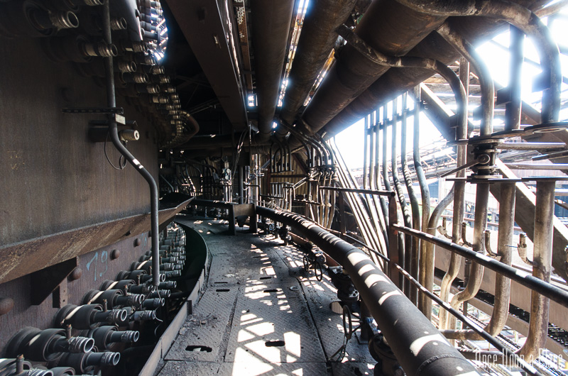 C'est sans doute la partie qui nous a le plus marqués, par sa taille et son esthétisme industriel. Juste en dessous il y a le plancher de coulée, les rigoles et la boucheuse, un peu plus loin la cheminée, la partie inférieure des cowpers, les trémies... Nous avons devant nous un véritable dédale de tuyaux, d'escaliers et de passerelles au milieu duquel nous nous sentons bien petits !