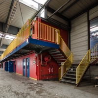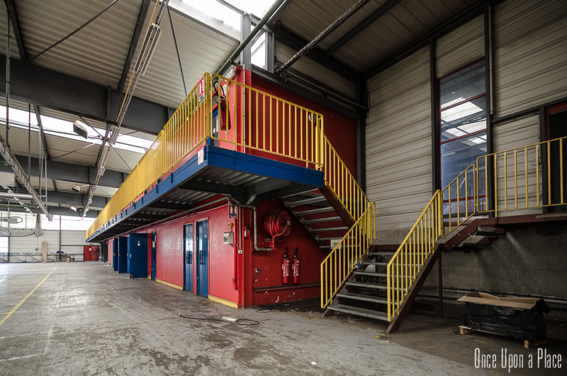 Cette zone très lumineuse devait être le centre névralgique de l’entrepôt. Une agréable surprise architecturale nous attendait : tout un pan de mur peint d’un rouge très vif donne un certain intérêt au lieu. C’est étrange et dynamisant à la fois. Ce choix de couleur intrigue, surtout avec le bleu prononcé des portes du bas ! A l’étage, juste des bureaux. Quelques vieux dossiers et autre calendriers permettent de dater l’abandon du site.
