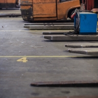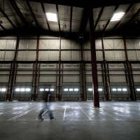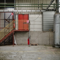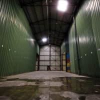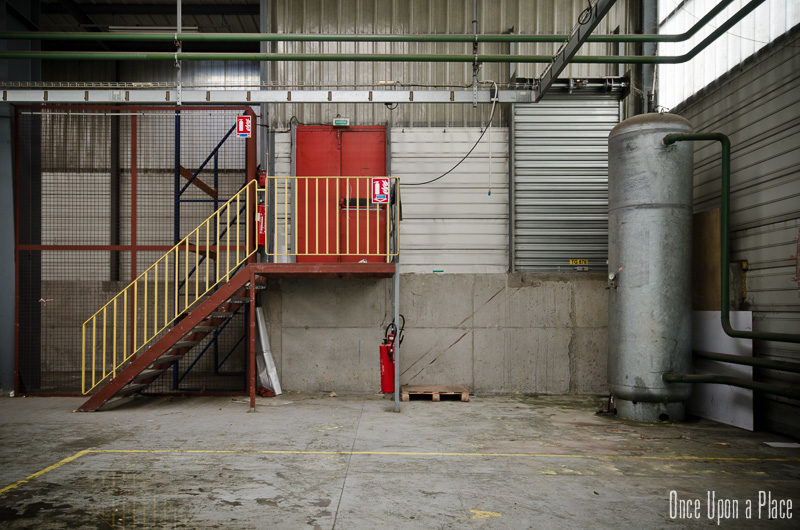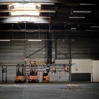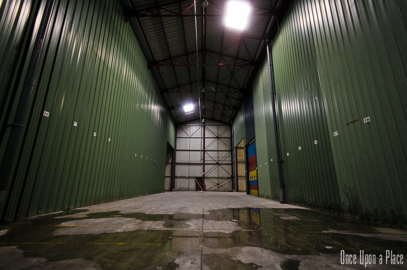 L'accès se fait sans difficulté. Nous pénétrons dans la zone principale : un vaste hangar très sombre souillé par de nombreuses tâches d’huile encore odorantes. Tout à été vidé, à l’exception d’une zone qui est devenue un cimetière de chariots élévateurs. Pourtant ils ne semblaient pas être en si mauvais état que ça.