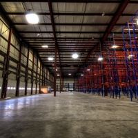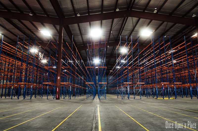 Nous progressons enfin vers la troisième et dernière aile : le stockage. Un impressionnant réseau de profilés métalliques donne de belles perspectives… voire le vertige. C’est immense. Bien plus grand qu’on ne l’imaginait de l’extérieur. Des racks à perte de vue s’étendent sur quatre niveaux. Il remplissent intégralement l’entrepôt. Étonnant même qu’ils n’aient pas été démontés.