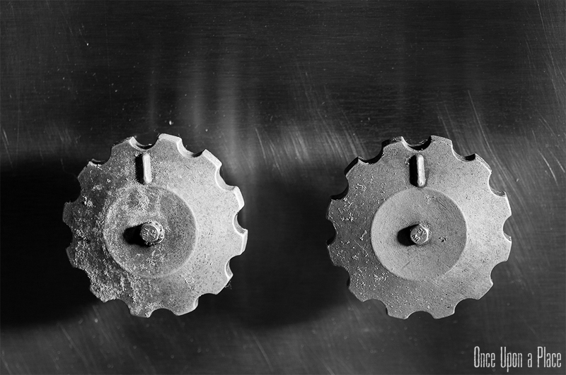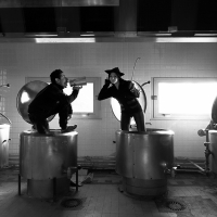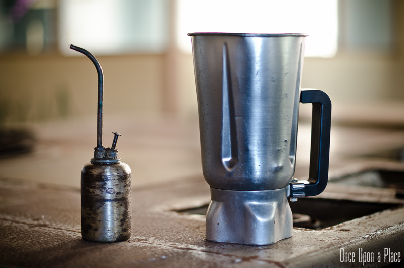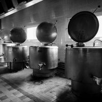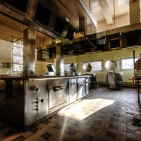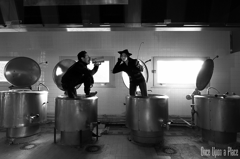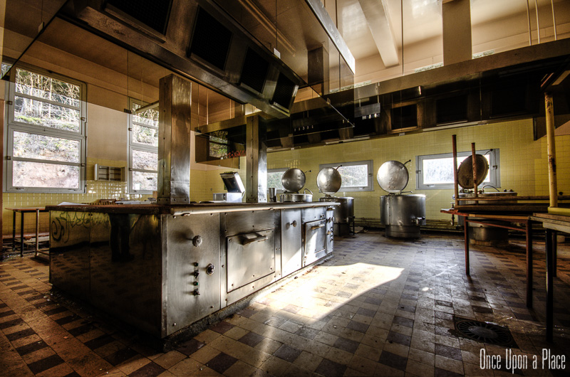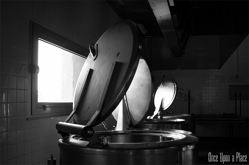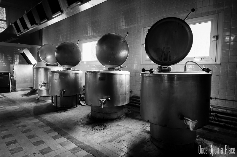 S'introduire dans le bâtiment nous a demandé un peu de gymnastique mais nous sommes directement dans la partie du bâtiment que par la suite, nous avons jugée la plus intéressante. Quelques marches au-dessus de nous se trouve la cuisine, une belle pièce où trônent encore les grandes marmites rondes et l'ilôt central avec ses fourneaux. Nous tombons sous le charme de ces marmites et décidons de faire quelques mises en scène avec.