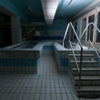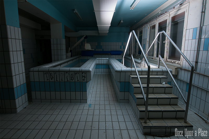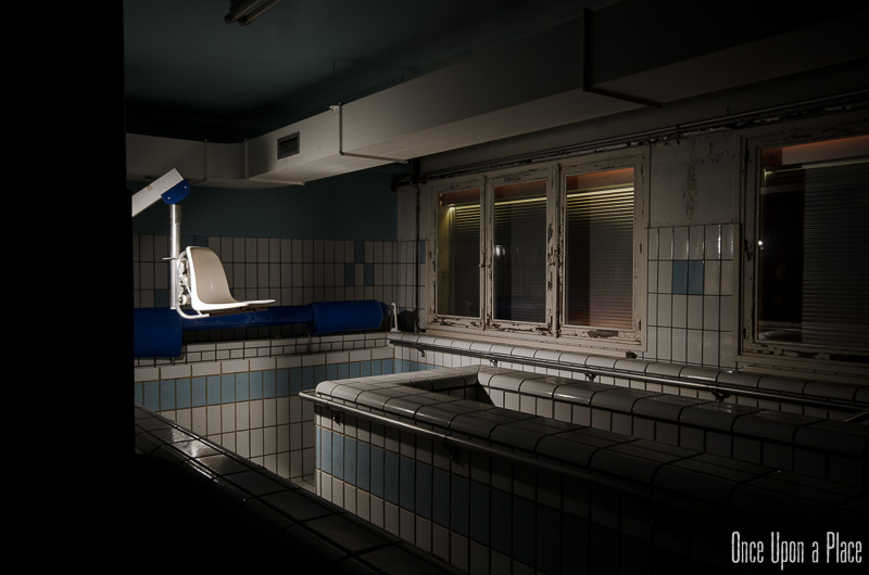 Nous explorons tout, couloir après couloir et finissons par dénicher l'accès au sous-sol. Nous savions qu'il y en avait un qui nous promettait quelque chose d'intéressant. Et en effet, c'est là que se trouve la balnéothérapie avec sa chaisse motorisée. Il reste même de l'eau au fond du bassin. L'endroit est plongé dans le noir complet, c'est donc à l'aide de nos frontales que nous réaliserons nos photos.