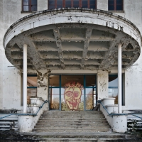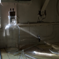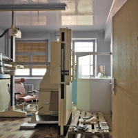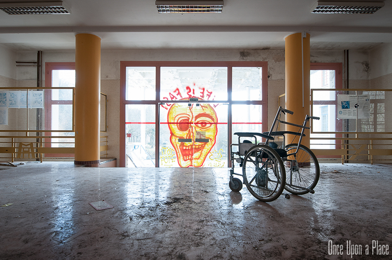 Après cette petite heure de distraction nous poursuivons la visite. Nous arrivons dans le hall d'entrée où un fauteuil roulant surveille les portes. Un peu plus loin nous découvrons les pièces de radiographie où le matériel est encore là, puis un laboratoire avec ses fioles, pipettes, et autres fournitures médicales.