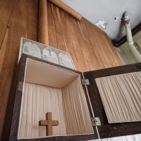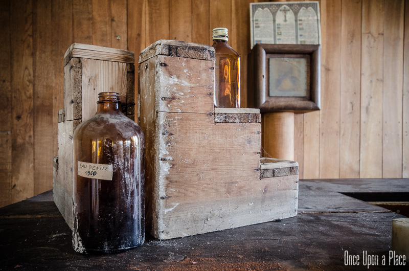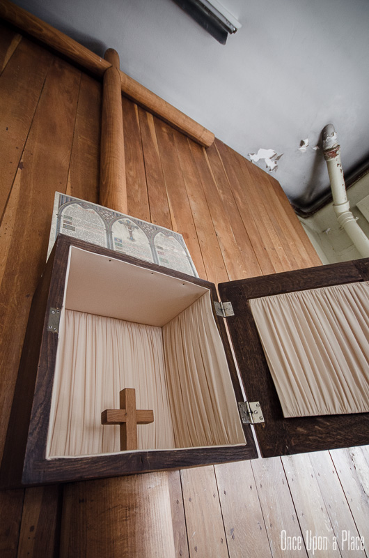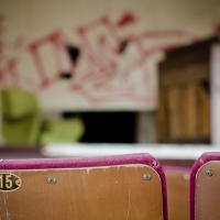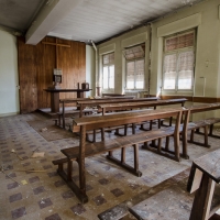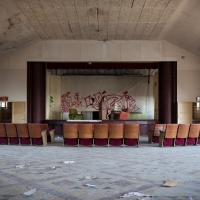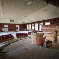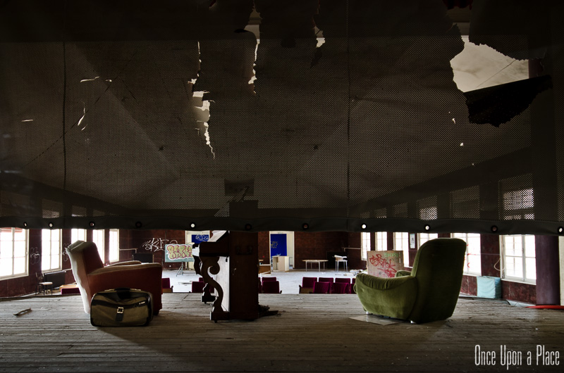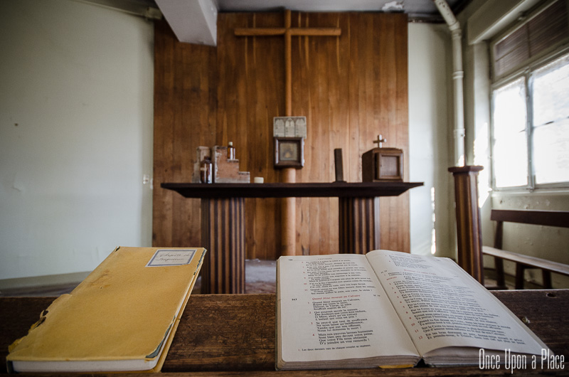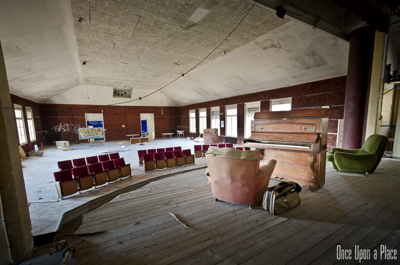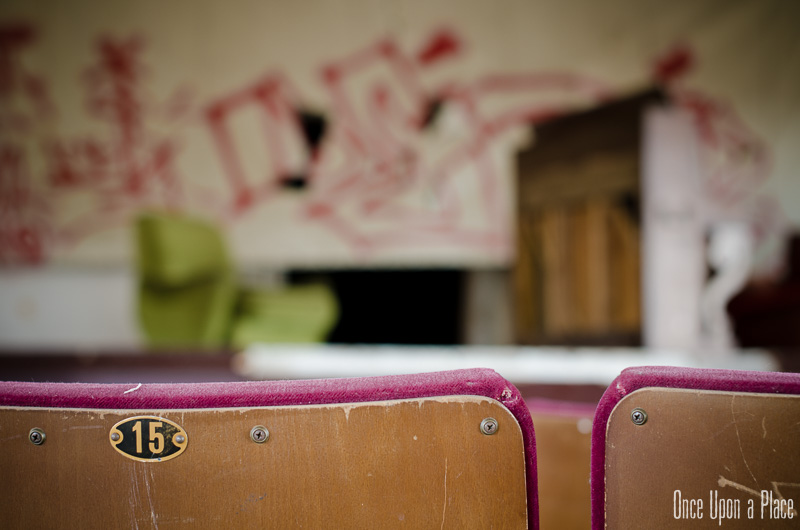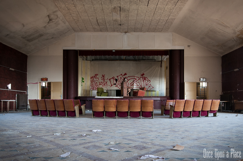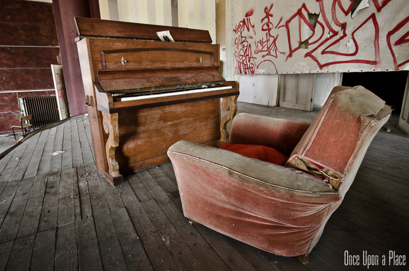 Nous ne sommes pas déçus, même si, depuis les photos que nous avions vues, le mobilier a changé de place ou a été volé. Dans la chapelle, le prie-dieu a disparu, et l'harmonium a été déplacé dans la salle de spectacle. Le malheureux a bien souffert et ses pistons ne sont plus là. Quant au piano, à force d'avoir été déplacé, il n'émet plus aucun son. Nous apprendrons quelques mois plus tard, que non seulement après avoir été victime de vandalisme et entièrement repeint à la bombe, il a fini son existence en étant défenestré... On peut se demander ce qui justifie un acte aussi stupide, de notre côté nous avons déjà notre avis sur la question.