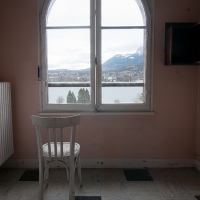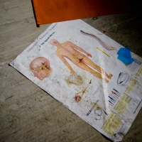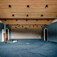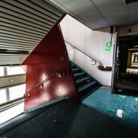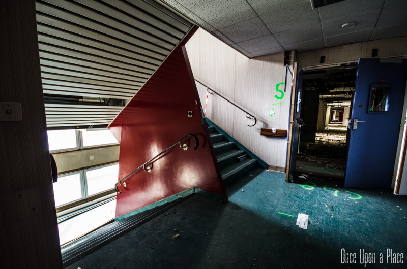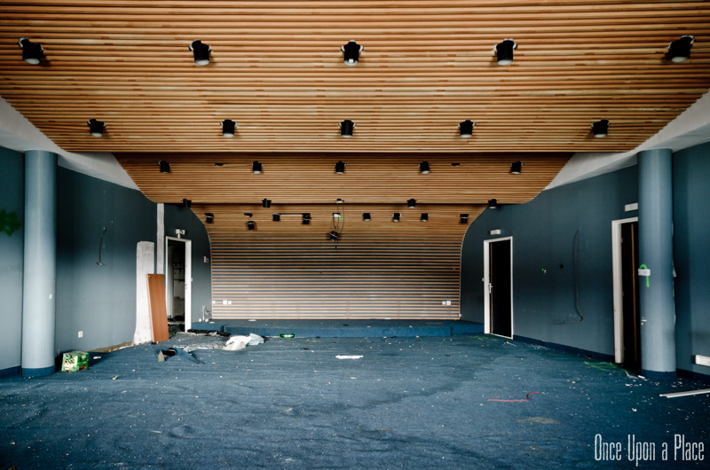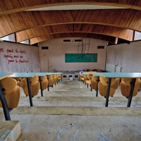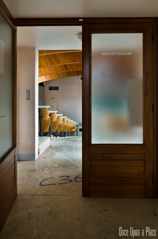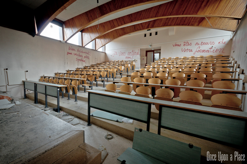 Ce premier bâtiment ne présente pas grand intérêt mis à part l'amphithéâtre peu endommagé. Les sièges sont tous là. Les murs sont recouverts de tags et le tableau affiche le passage de nombreux autres explorateurs.
