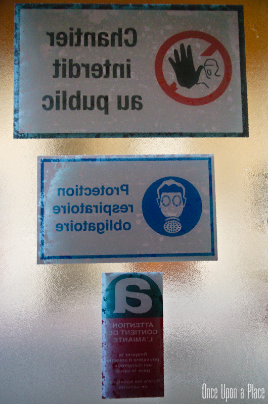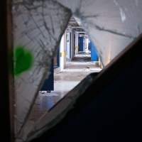 Nous nous faufilons dans le premier bâtiment. Difficile de se repérer car le site est vaste. Le vent fait jouer les portes entrouvertes et nous pensons alors ne pas être seuls. Après ce petit moment de frayeur, voilà le 4x4 du gardien faisant sa ronde qui vient se garer devant l’entrée que nous avons empruntée. Lampes éteintes et retenant notre souffle, nous attendons. Les minutes s’écoulent lentement mais finalement la voiture repart. Nous pouvons commencer la visite.