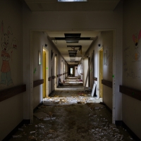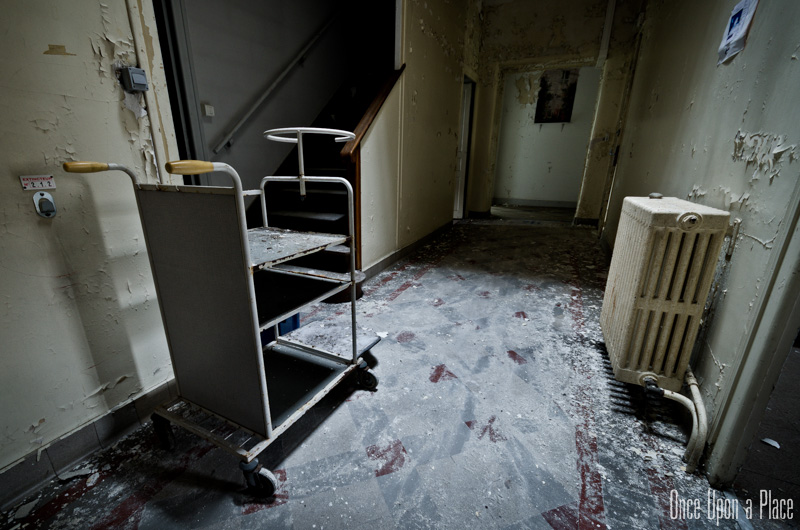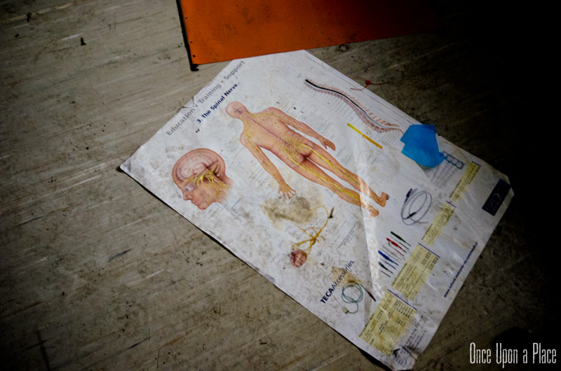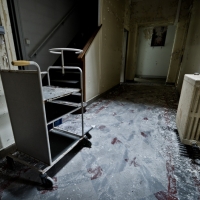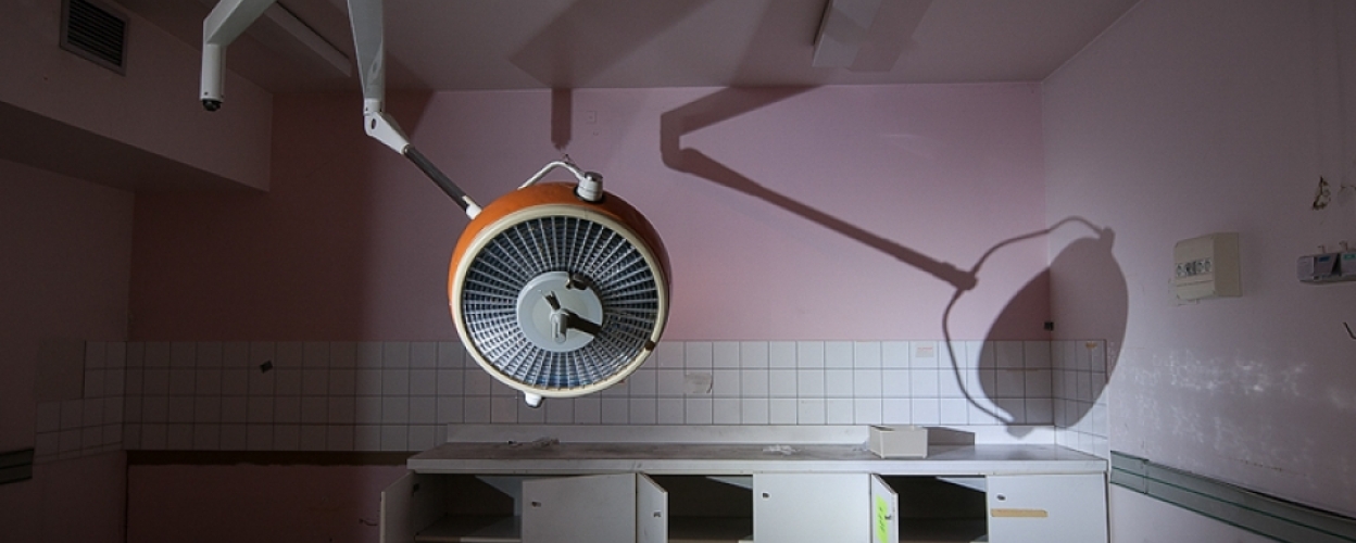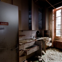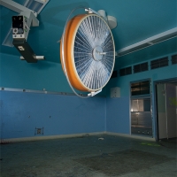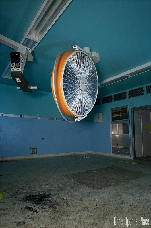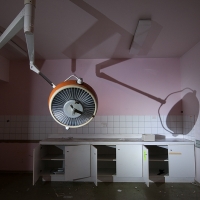 Nous progressons lentement, essayant de trouver des pièces encore intactes, mais très peu ont résisté aux récupérateurs ou airsofteurs. Seules les odeurs médicales n'ont pas encore été totalement détruites par le temps. Après avoir arpenté un dédale de couloirs, nous trouvons les blocs opératoires : des pièces sans fenêtre avec une immense lampe suspendue au milieu. Et belle surprise, encore intacte.