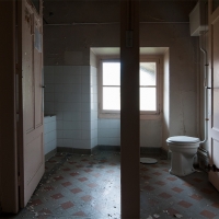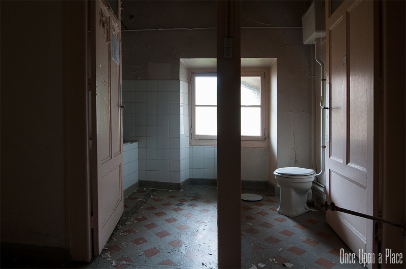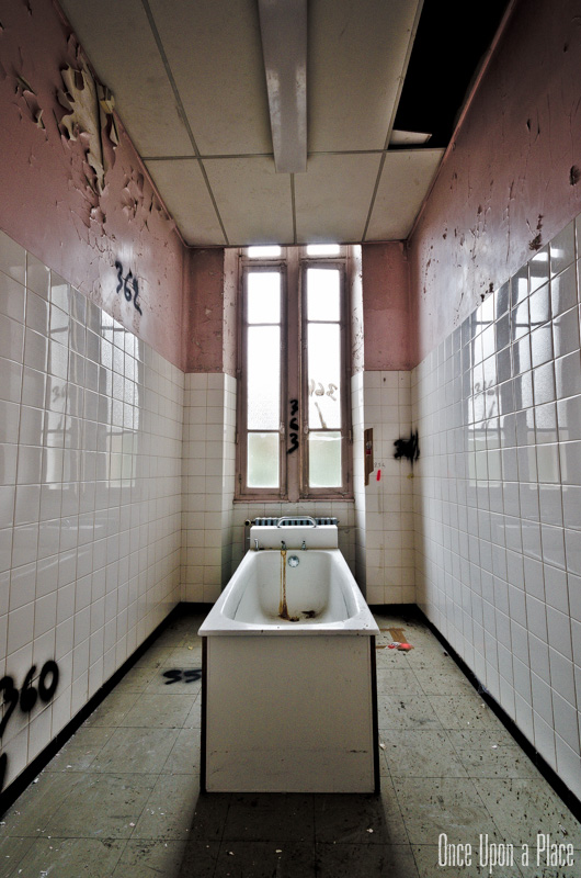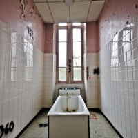 Nous entrons ensuite dans le bâtiment principal par une porte de service de la radiologie. Les couloirs de cette aile sont sombres et humides et notre seule découverte intéressante sera une pièce en longueur où trône une baignoire reteintée par la rouille.