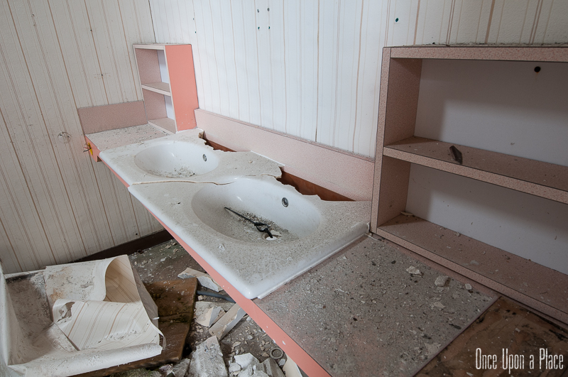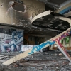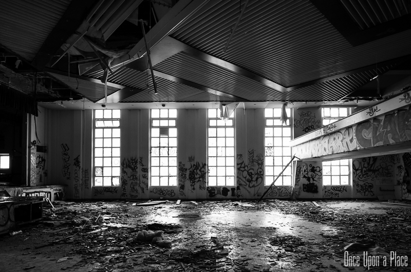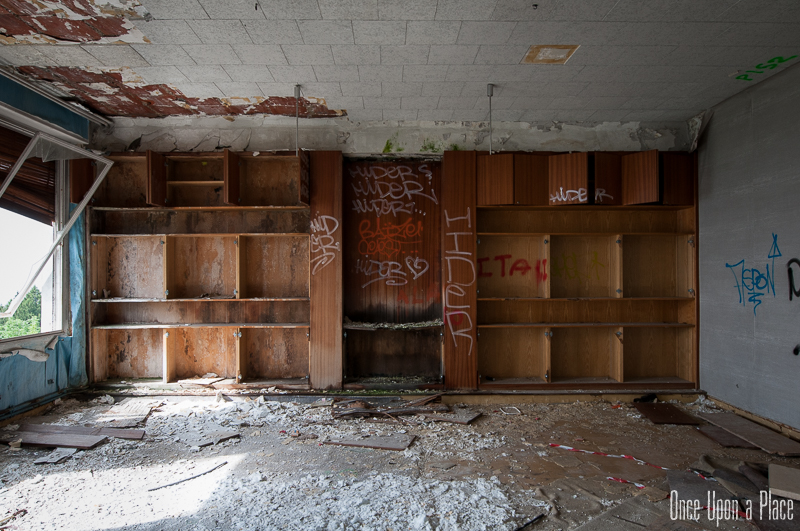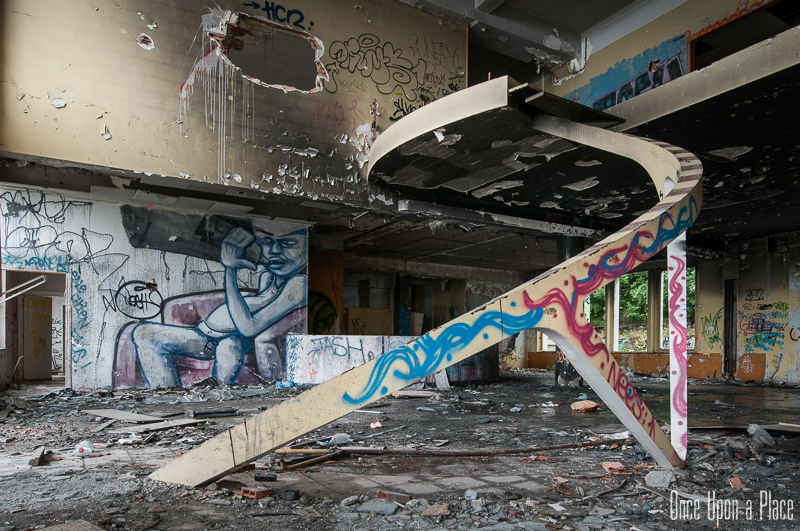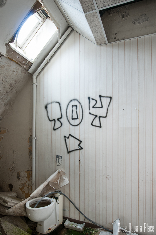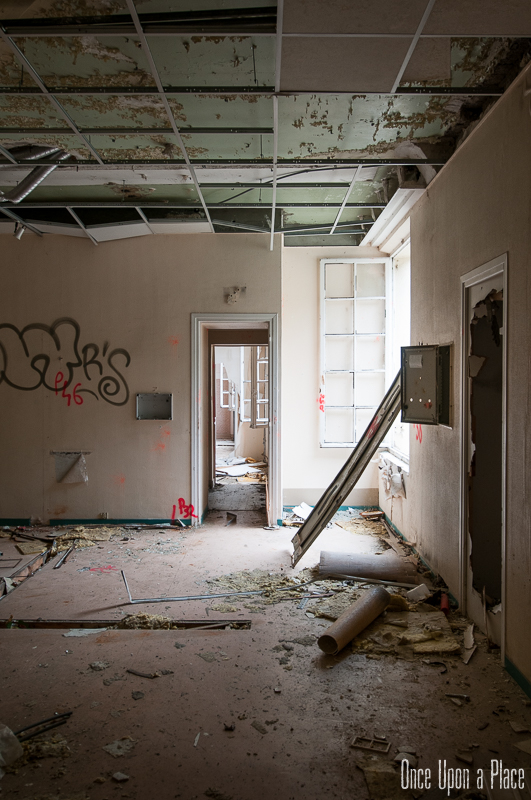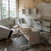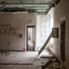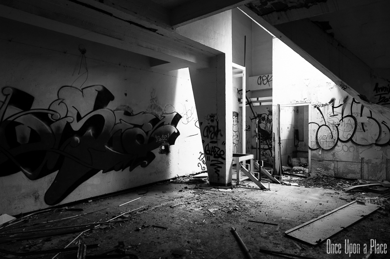L'exploration sera de courte durée, il n'y a pas grand chose à voir. Nous avançons avec difficulté dans des couloirs où s'entassent portes, verre cassé, gravats, pour découvrir des pièces, toutes semblables, vides et ravagées.