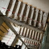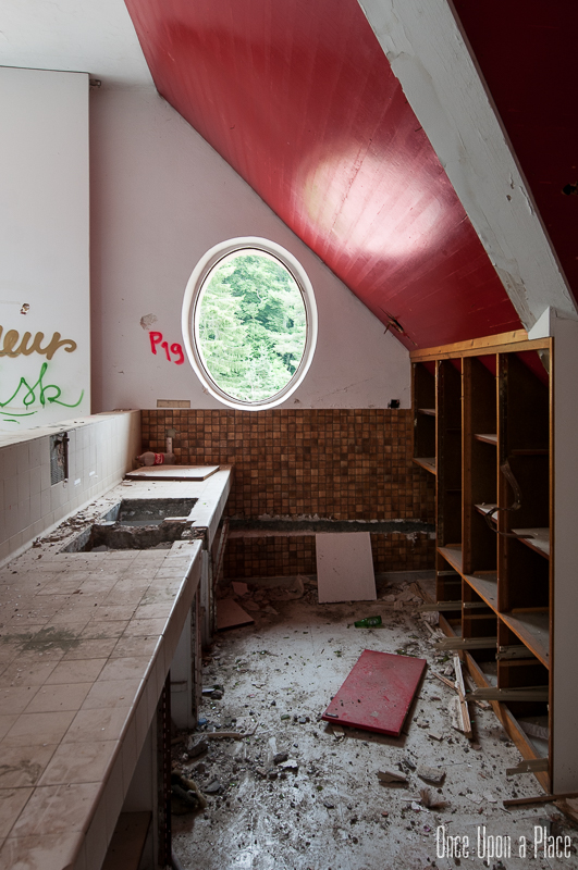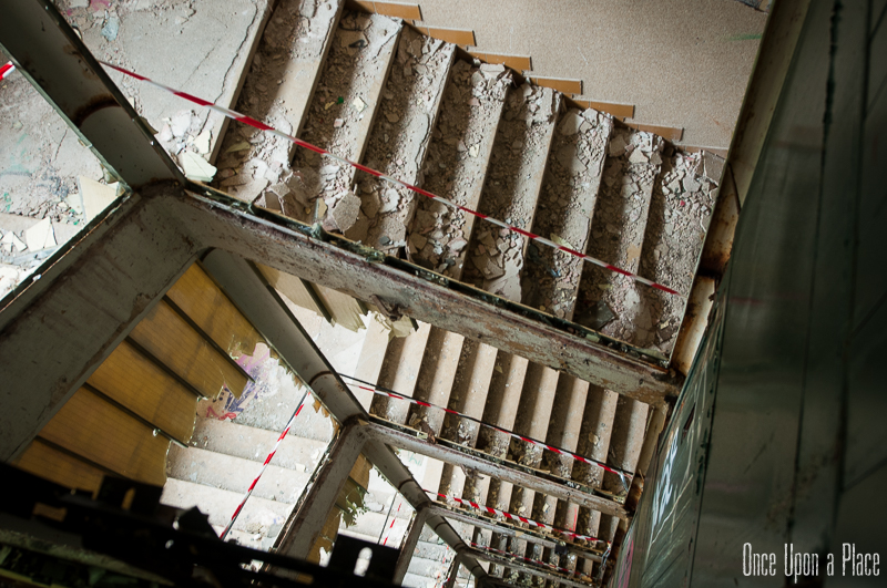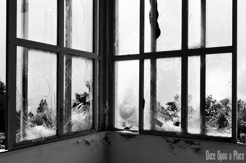 L'état de l'édifice est encore pire que ce que nous pensions, aussi déprimant que le temps brumeux et humide qui nous enveloppe. Il ne reste plus rien, tout a été dépecé. Des trous béants dans les murs, quelques rares meubles défoncés, un escalier dont il ne reste que la structure de soutien, la mousse qui commence à s'installer aux endroits les plus exposés aux intempéries, propogeant une odeur de moisi qui flotte doucement dans l'air ambiant.