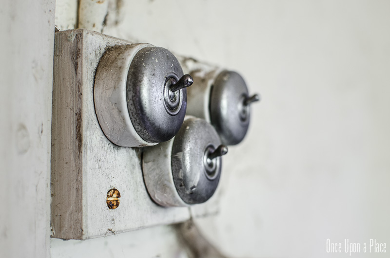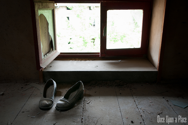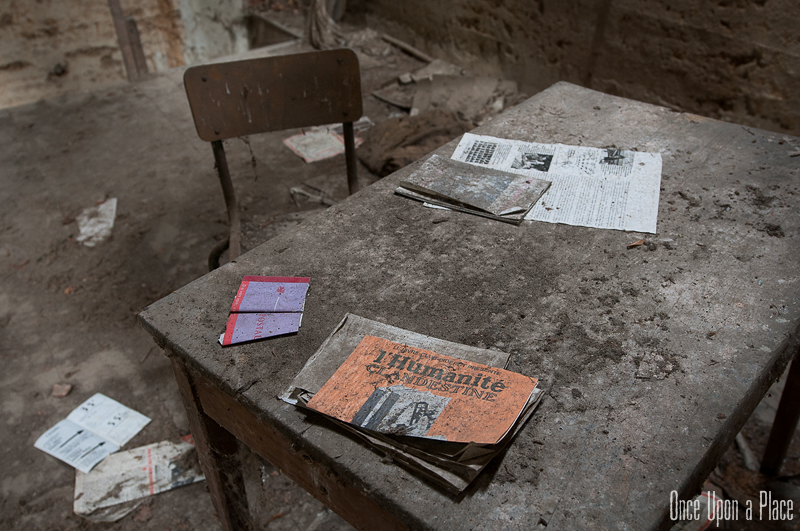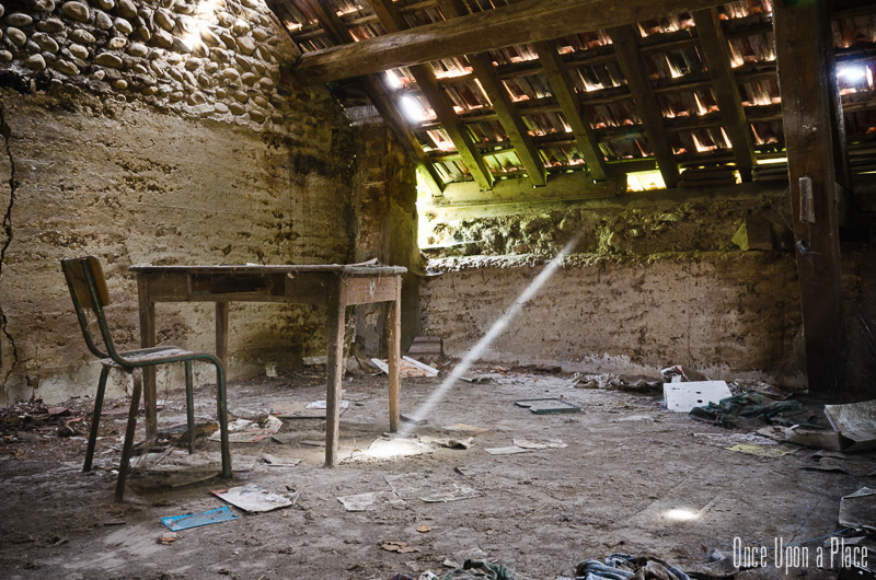 Nous entamons la visite par la première construction annexe. Le rez-de-chaussée présente peu d'intérêt, à l'étage nous trouvons quelques lits, des journaux, mais le grenier nous a tout de suite séduits ! Le toit, par ses tuiles manquantes, laisse entrer les rayons du soleil, mis en évidence par la poussière stagnante. Nous prenons plaisir à photographier cette scène, avec le peu de mobilier présent.
