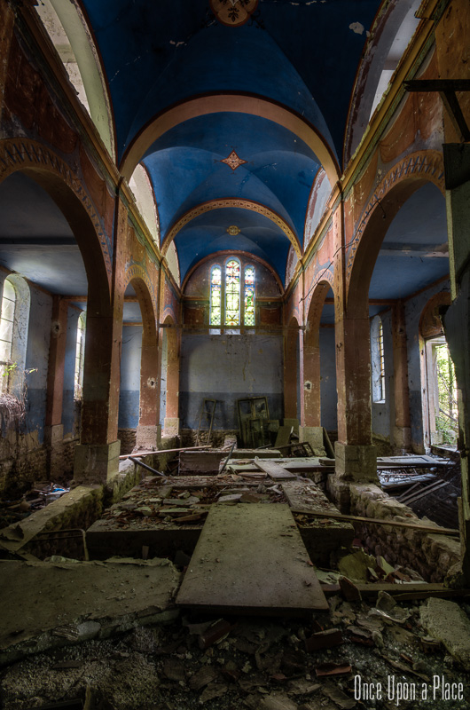 C'est ensuite avec le chant du coq que nous pénétrons dans le bâtiment principal par la chapelle. Le plancher a disparu, les vitraux ne sont plus en bon état, mais en observant les peintures défraîchies sur les arcs et les voûtes, on peut imaginer à quel point cette pièce a dû être magnifique.