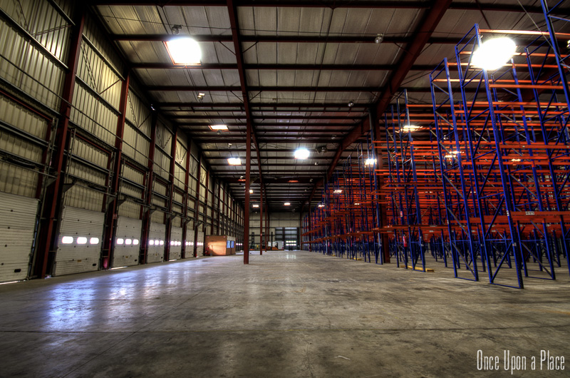 Nous progressons enfin vers la troisième et dernière aile : le stockage. Un impressionnant réseau de profilés métalliques donne de belles perspectives… voire le vertige. C’est immense. Bien plus grand qu’on ne l’imaginait de l’extérieur. Des racks à perte de vue s’étendent sur quatre niveaux. Il remplissent intégralement l’entrepôt. Étonnant même qu’ils n’aient pas été démontés.